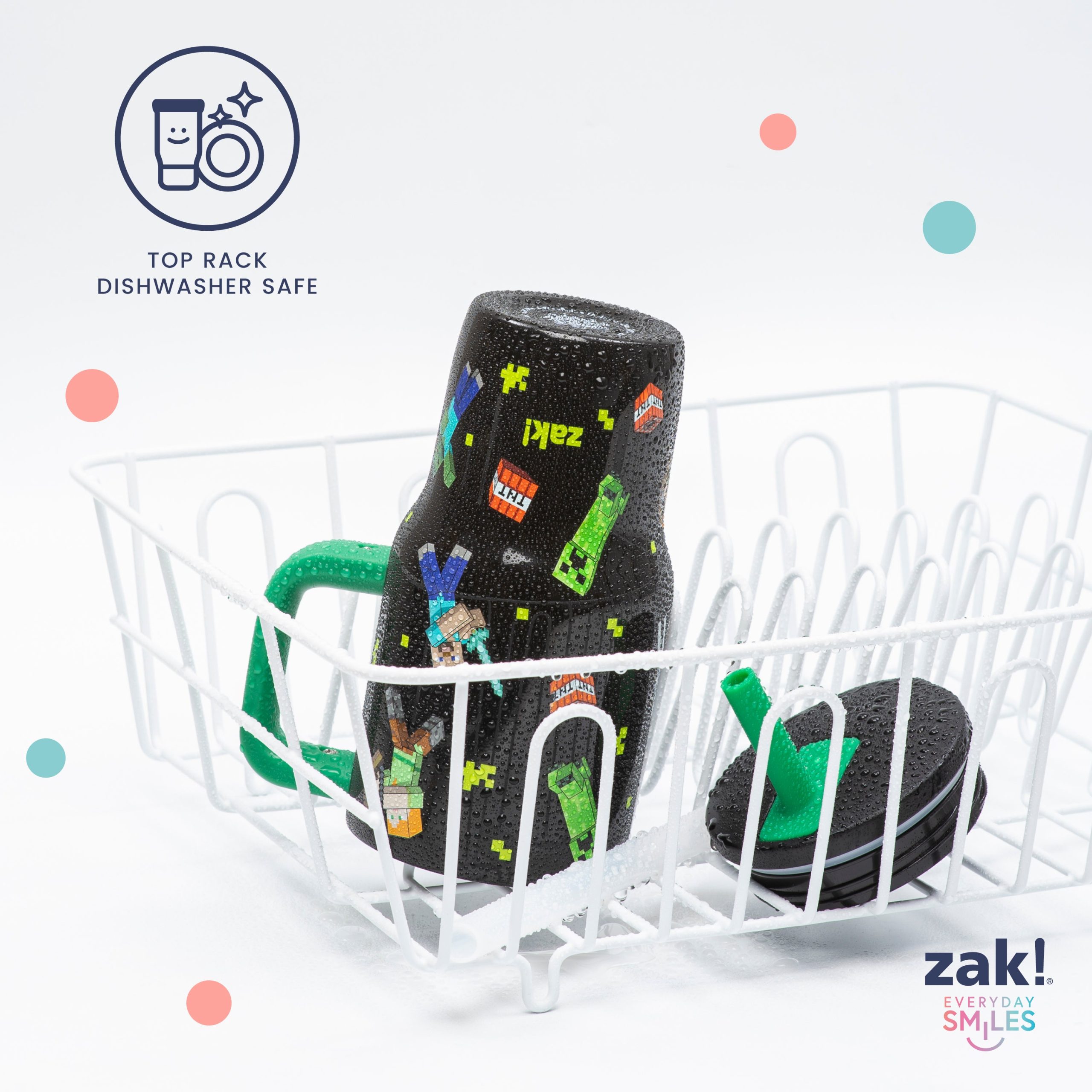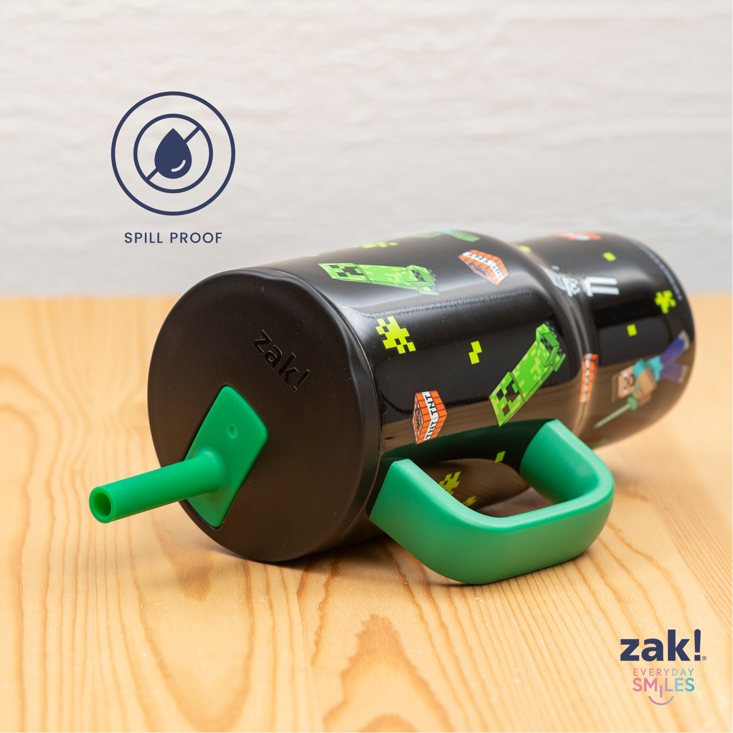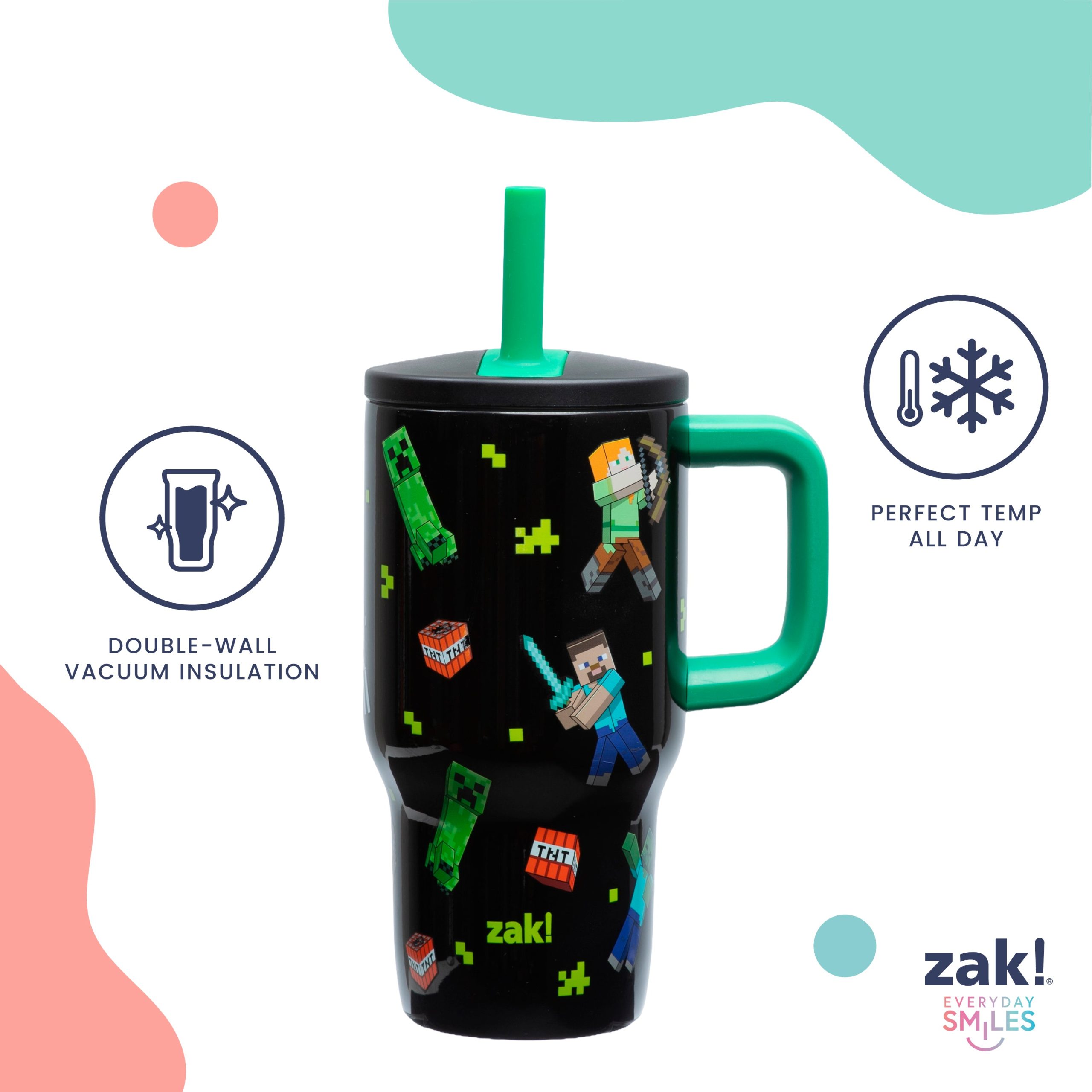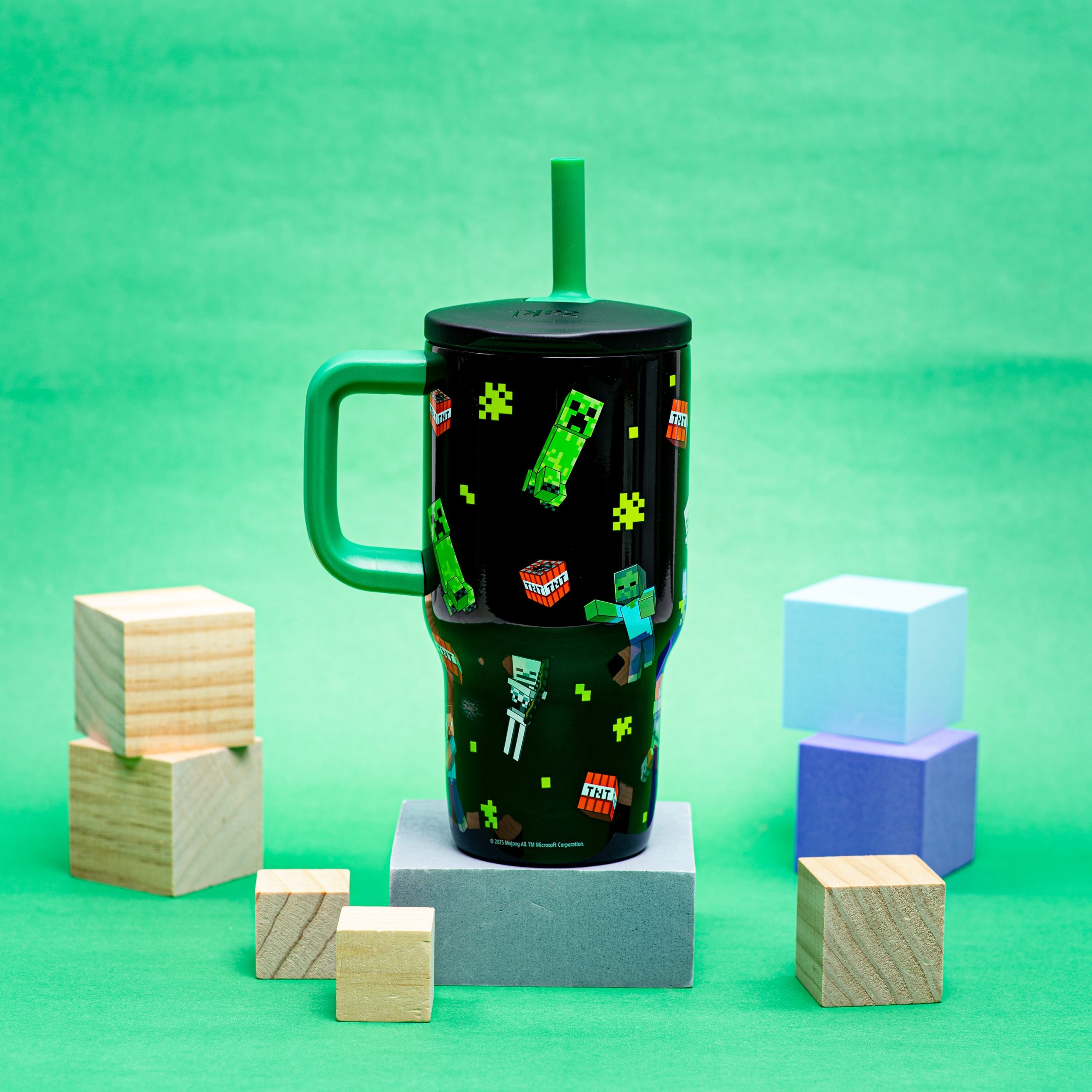The 16-ounce Minecraft tumbler is made of durable stainless steel. with vacuum insulation that keeps drinks fresh and cool while stopping condensation and water rings. It has a silicone straw that’s comfortable to sip from. as well as sealed to the lid to help prevent splashes and spills. When you’re on the go. the handle gives you a secure grip and the tumbler fits in most car cup holders. making travel easy and convenient. And at the end of the day. the durable stainless steel straw tumbler is top rack dishwasher safe for easy cleanup! Use it with kids age 3 and up for cold drinks only. and do not microwave.