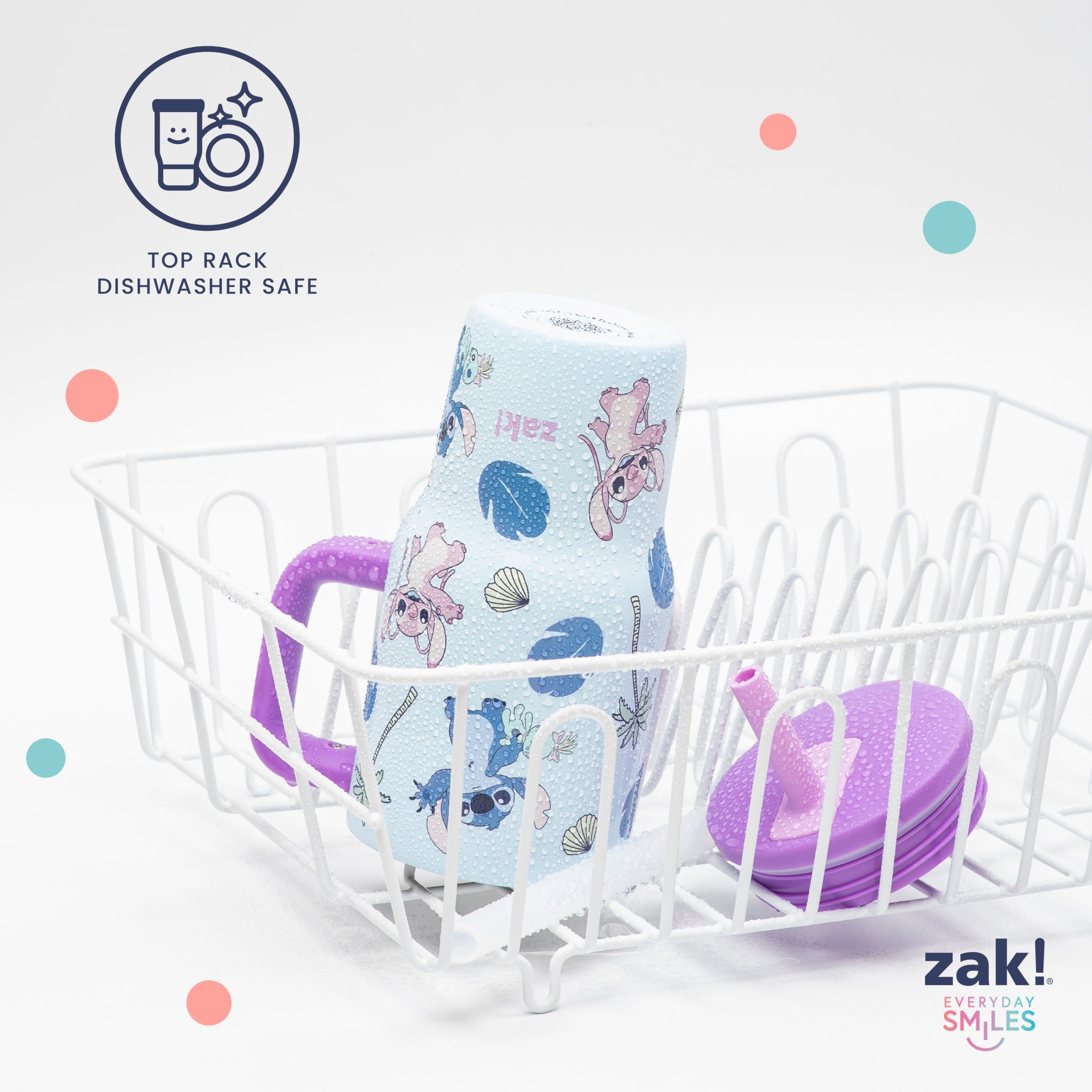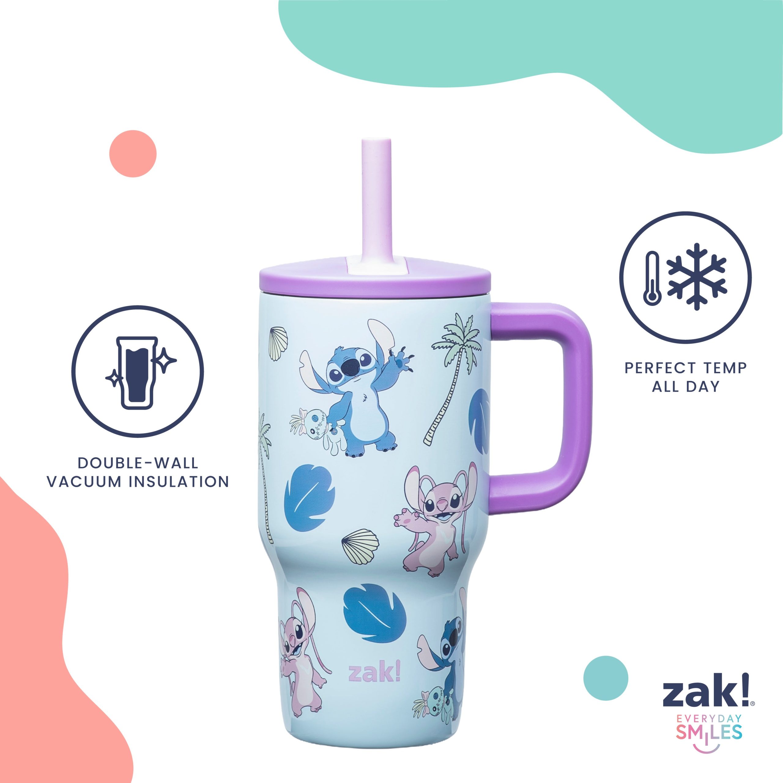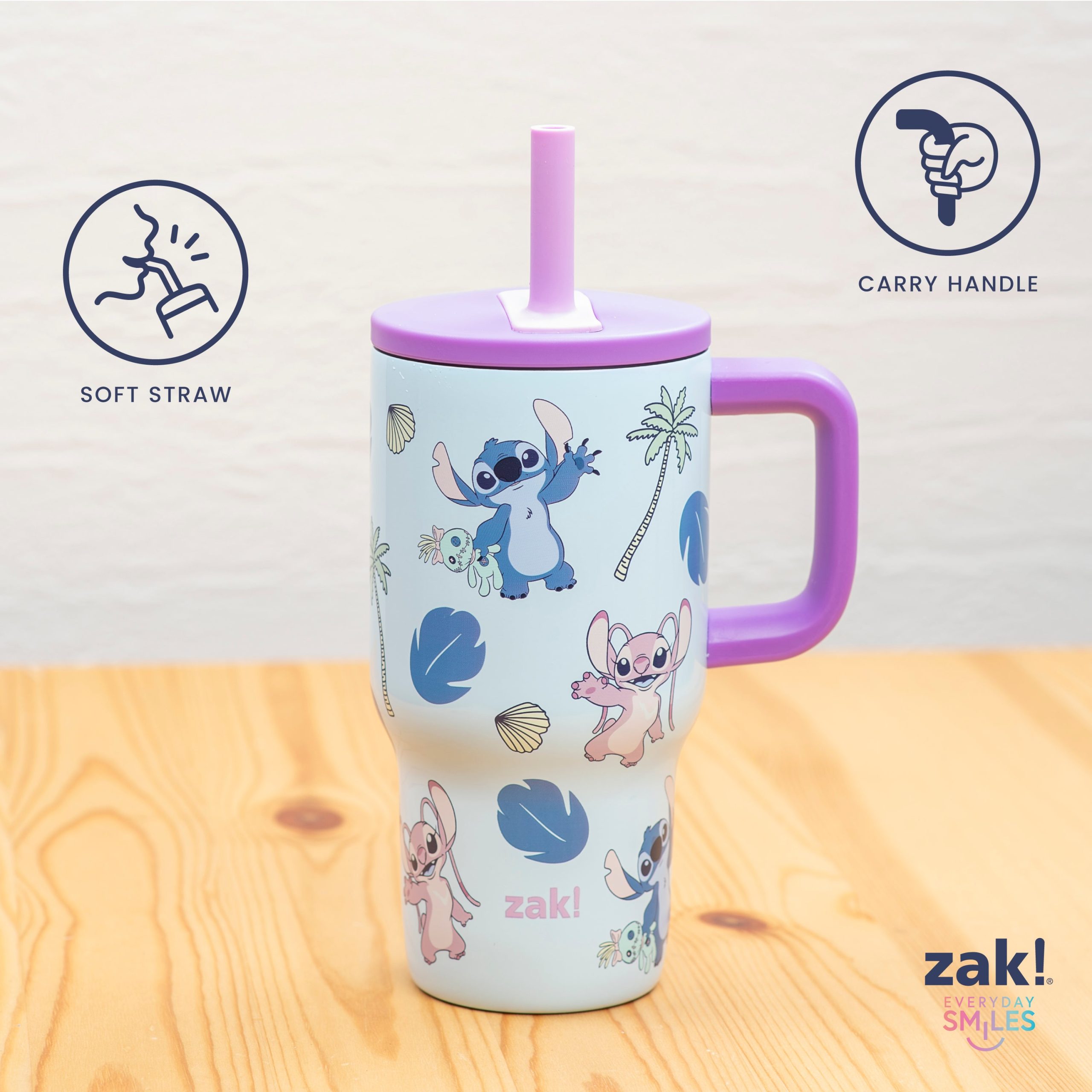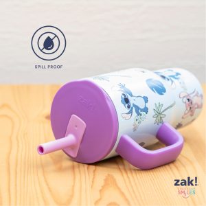 The 16-ounce Lilo & Stitch tumbler is made of durable stainless steel. with vacuum insulation that keeps drinks fresh and cool while stopping condensation and water rings. It has a silicone straw that’s comfortable to sip from. as well as sealed to the lid to help prevent splashes and spills. When you’re on the go. the handle gives you a secure grip and the tumbler fits in most car cup holders. making travel easy and convenient. And at the end of the day. the durable stainless steel straw tumbler is top rack dishwasher safe for easy cleanup! Use it with kids age 3 and up for cold drinks only. and do not microwave.