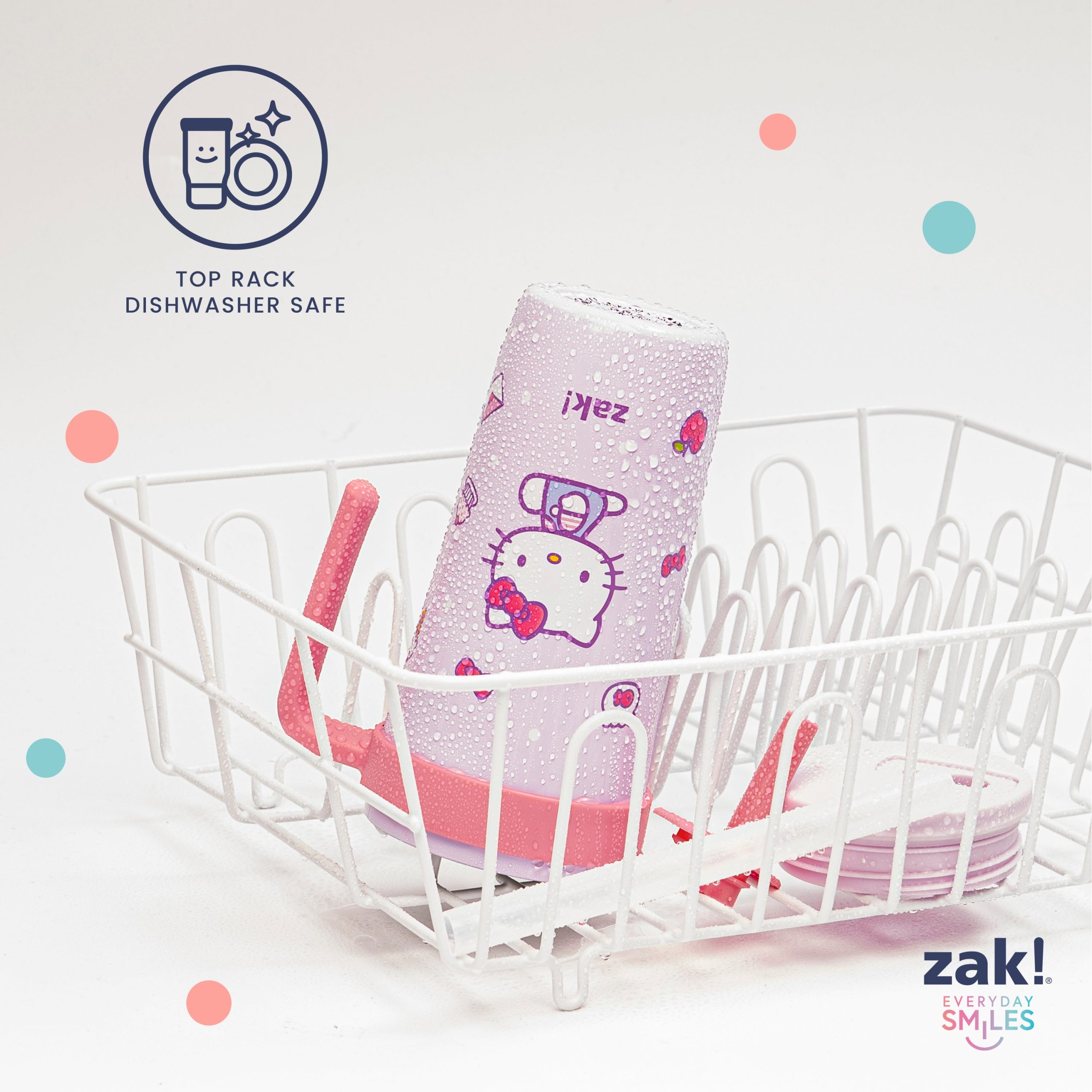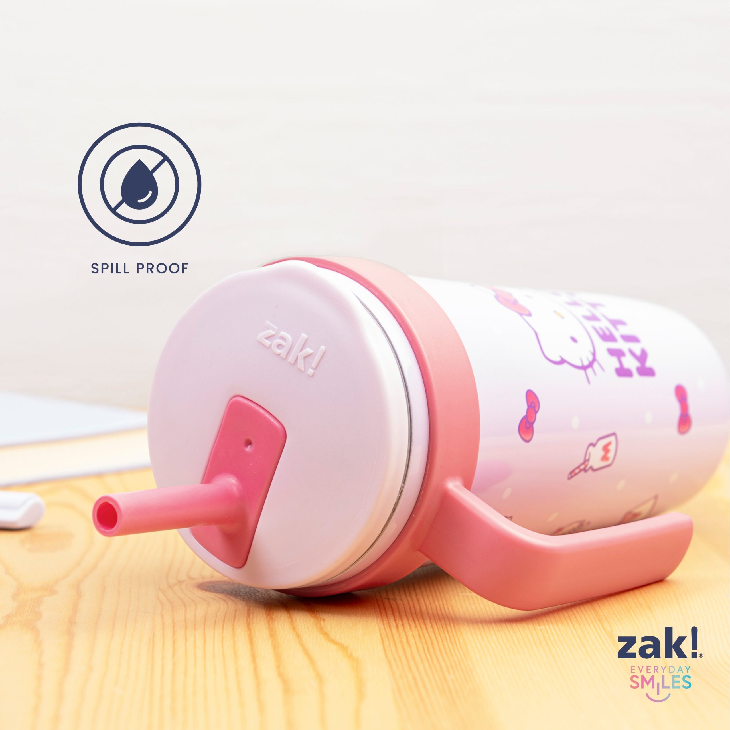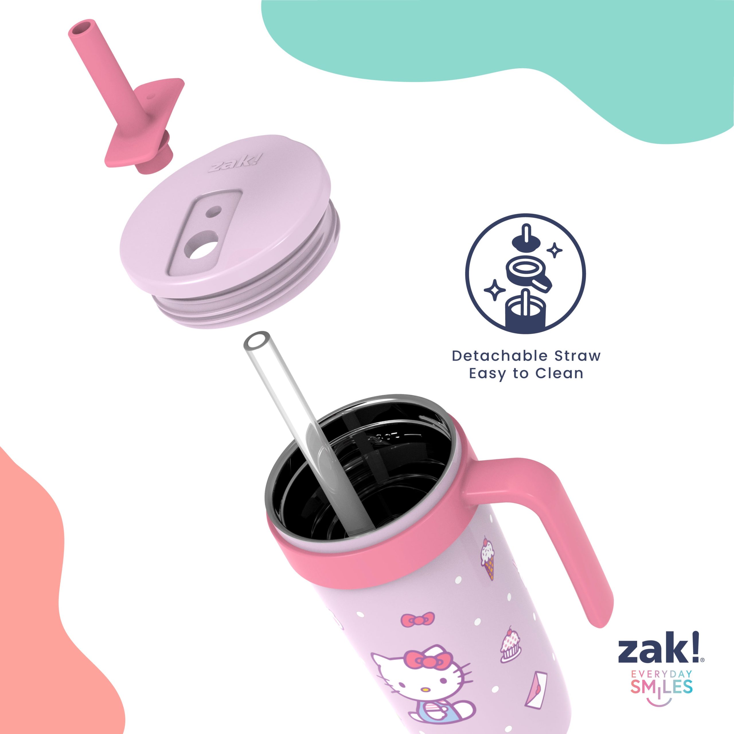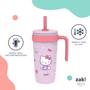 The 18-ounce Hello Kitty tumbler is made of durable stainless steel. with vacuum insulation that keeps drinks fresh and cool while stopping condensation and water rings. It has a silicone straw that’s comfortable to sip from. as well as sealed to the lid to help prevent splashes and spills. When you’re on the go. the handle gives you a secure grip and the tumbler fits in most car cup holders. making travel easy and convenient. And at the end of the day. the durable stainless steel straw tumbler is top rack dishwasher safe for easy cleanup! Use it with cold drinks only and do not microwave.