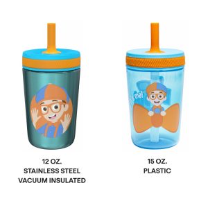 Let’s keep it simple: these Blippi tumblers don’t leak. The silicone sipper spout design has a built-in valve that stops water from flowing when no one is drinking: it’s easy for children to quench their thirst. but won’t make a mess if the tumbler is tipped over. It’s the perfect choice for active kids. or young ones just graduating from sippy cups who aren’t ready for an open-topped tumbler yet. Two tumblers and a bonus sipper are included in the set—the 12-ounce stainless steel tumbler has vacuum insulation. which keeps drinks cold and eliminates water rings from condensation. and the 15-ounce plastic tumbler is lightweight and easy to carry. They’re both durable. reusable. and completely BPA free.