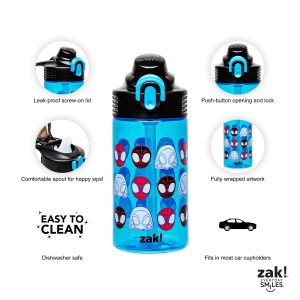 The 16-ounce Spidey water bottle is made of plastic. durable enough for kids to use every day and bring on any adventure. The lid screws on securely and won’t leak when the spout is closed. though water flows for easy drinking when the spout is open. It’s easy to release for quick access. and the button has a flip-up lock to keep it from activating accidentally. The drinking bottle fits in most car cup holders with a built-in carrying loop on the lid for easy transportation. and with the cover to keep the spout clean and closed. it can be tossed into a bag for worry-free travel.