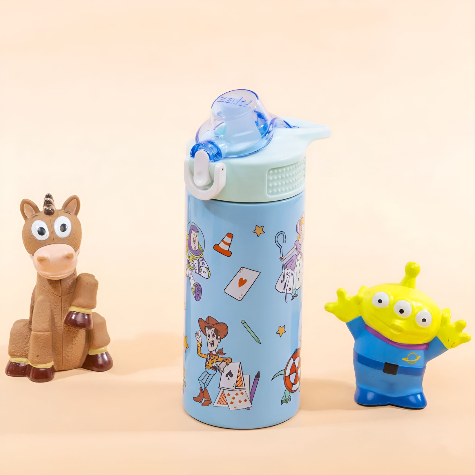The Toy Story 14-ounce water bottle is made of durable stainless steel. sturdy enough for kids to use every day and bring on any adventure. Vacuum insulation and double-wall construction will keep drinks cold for hours. while stopping condensation from leaving messy water rings. The lid screws on securely and won’t leak when the spout is closed. though water flows for easy drinking when the spout is open. It also has a quick-release button that makes water easy to access. and a flip-up lock to keep it from activating accidentally. The drinking bottle fits in most car cup holders with a built-in carrying loop for easy transportation. and with the cover to keep the spout clean and closed. it can be tossed into a bag for worry-free travel. At the end of the day. the lid is easy to disassemble for a thorough cleaning. and the water bottle is top rack dishwasher safe to simplify your routine. Use with cold drinks only and do not microwave.