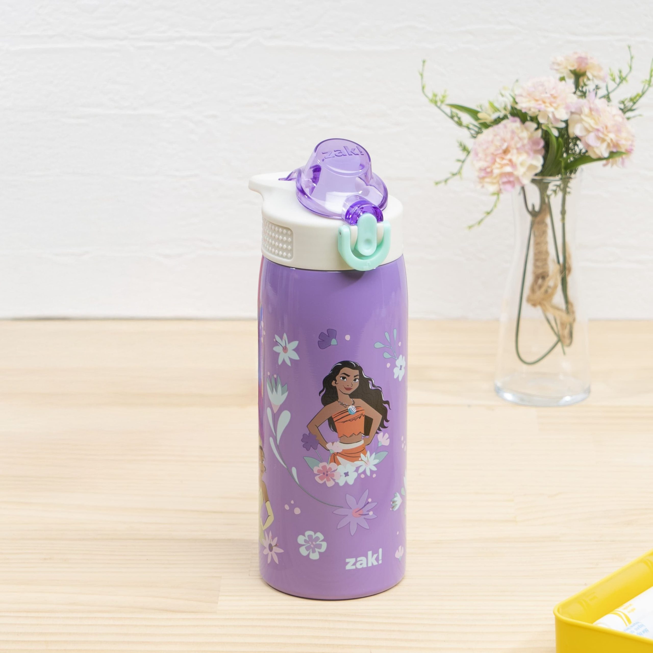 The Disney Princess 19-ounce water bottle is made of durable stainless steel. sturdy enough for kids to use every day and bring on any adventure. Vacuum insulation and double-wall construction will keep drinks cold for hours. while stopping condensation from leaving messy water rings. The lid screws on securely and won’t leak when the spout is closed. though water flows for easy drinking when the spout is open. It also has a quick-release button that makes water easy to access. and a flip-up lock to keep it from activating accidentally. The drinking bottle has a built-in carrying loop for easy transportation. and with the cover to keep the spout clean and closed. it can be tossed into a bag for worry-free travel. At the end of the day. the lid is easy to disassemble for a thorough cleaning. and the water bottle is top rack dishwasher safe to simplify your routine. Use with cold drinks only and do not microwave.
